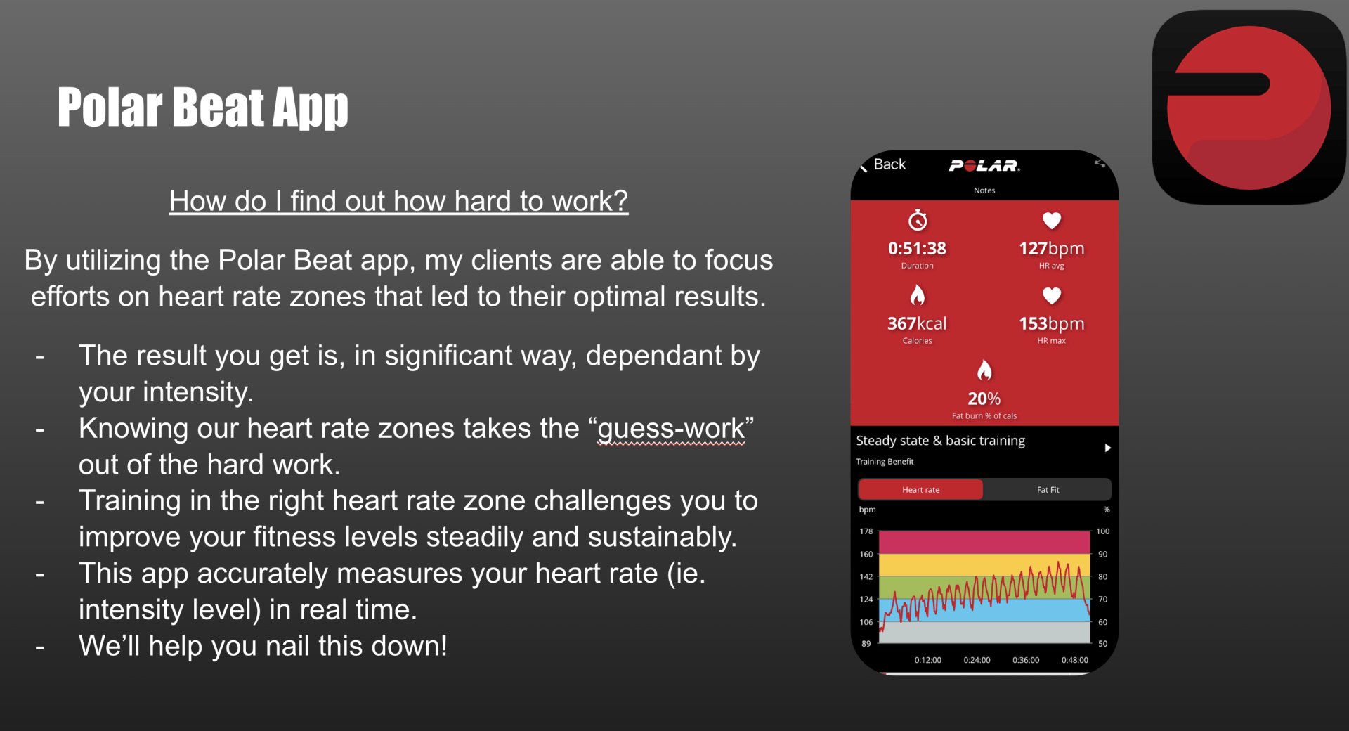 Here's a sample of some of the movements that we use to increase and track heart rate using the Polar watch/chest strap.